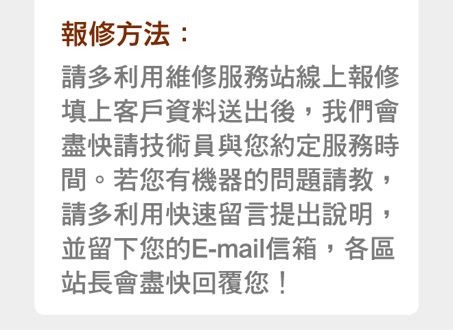 ◆ 服務站為了服務家電使用者,當您府上有家電故障需維修服務時,您可以多多利用線上報修填寫您的資料,我們有專人為您的資料做處理,很快的聯絡您,快速為您解決機器的問題。