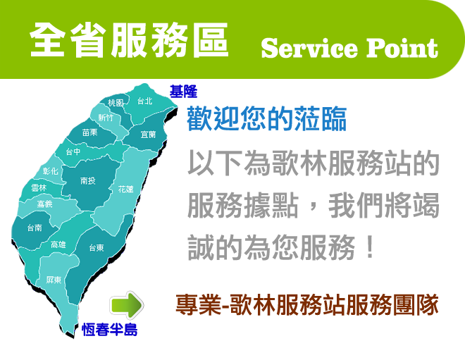 ◆ 服務站於台灣各區均有技術人員可以到府為您維修服務,不管您要維修歌林冷氣、冰箱、液晶電視、電視機、洗衣機、冷凍空調、除濕機、乾衣機..